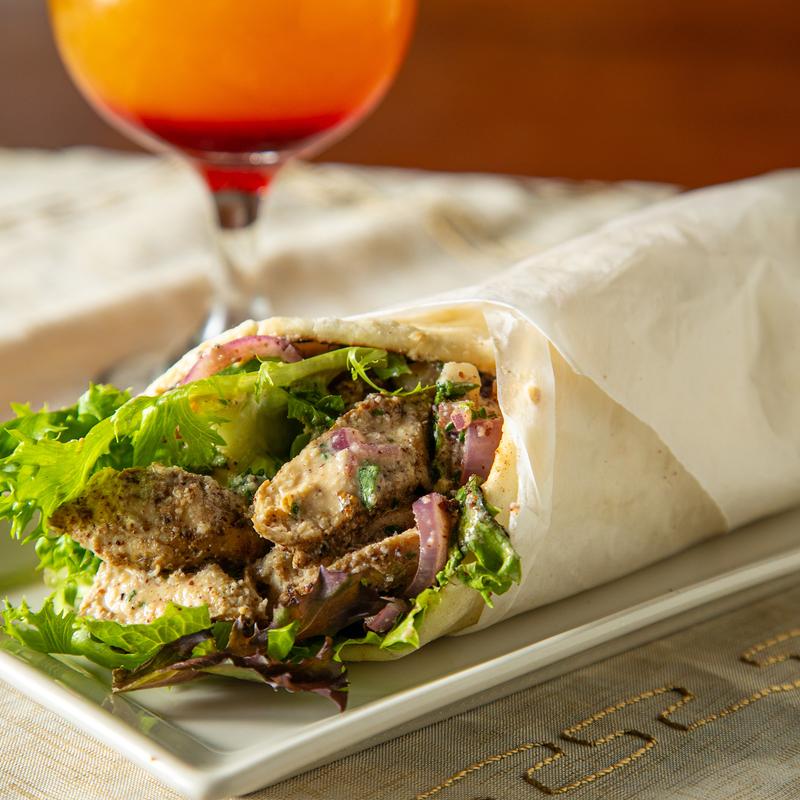 Sliced chicken wrapped in pita bread, topped with salad and sesame sauce & served with fries