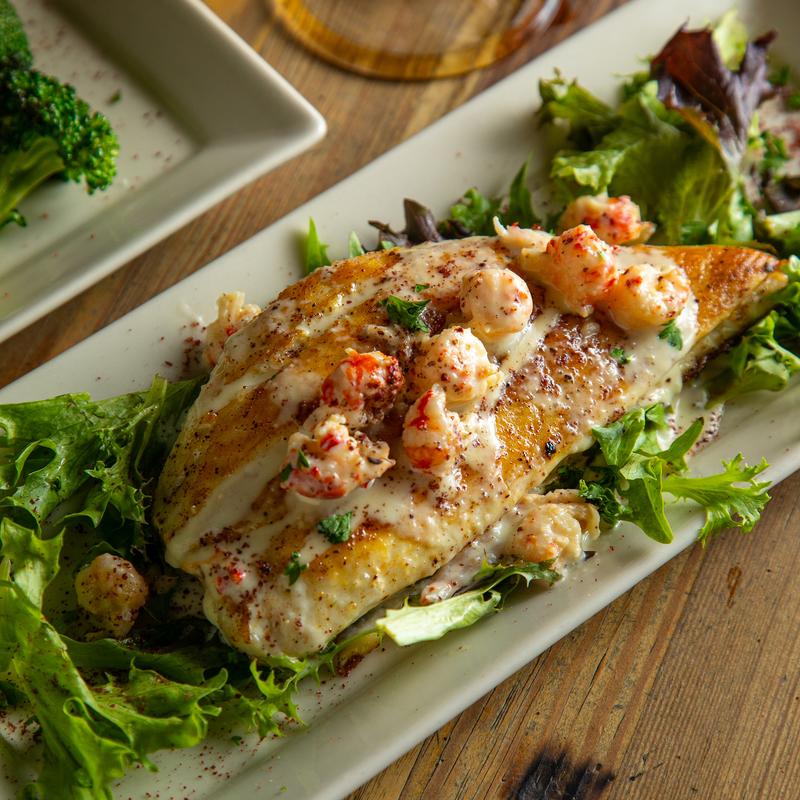Grilled lightly or fried, topped with crawfish cream sauce. Served with a side salad