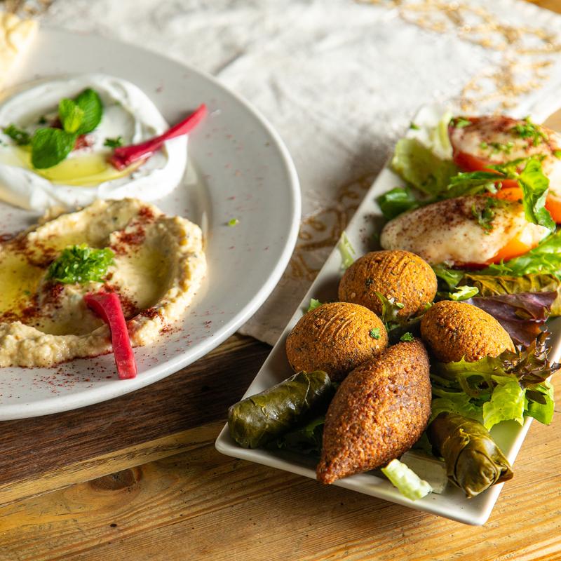 Babaghanough, hummus, kibby, lebneh, buffalo, grape leaves, falafel