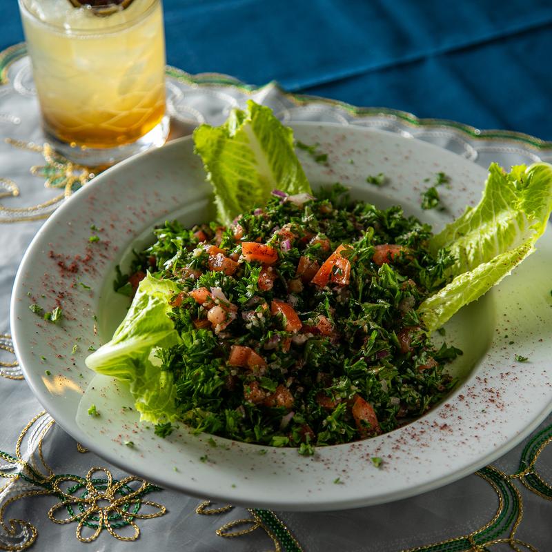 Finely chopped tomatoes, parsley, onions, cracked wheat, olive oil, and lemon juice
