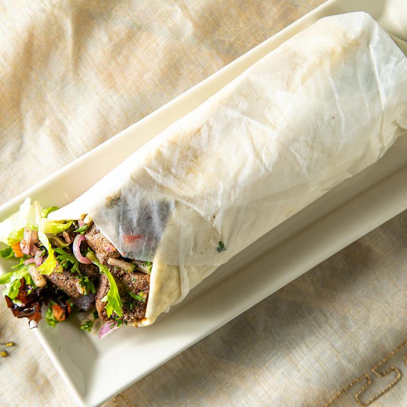 Sliced beef wrapped in pita bread, topped with salad and sesame sauce & served with fries